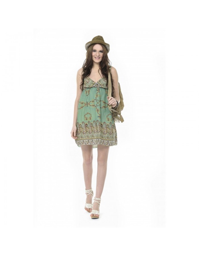 Printed chiffon knee length dress with tank straps. Deep v-neckline.